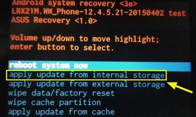 5. Select "apply update from internal storage" by volume key and then press power key to confirm.
